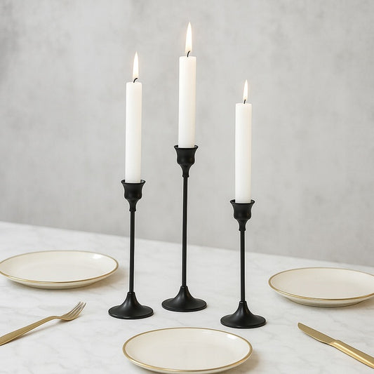 Świecznik metalowy czarny matowy – ZESTAW 6 szt., ELEGANCKA DEKORACJA STOŁU NA ŚWIECE