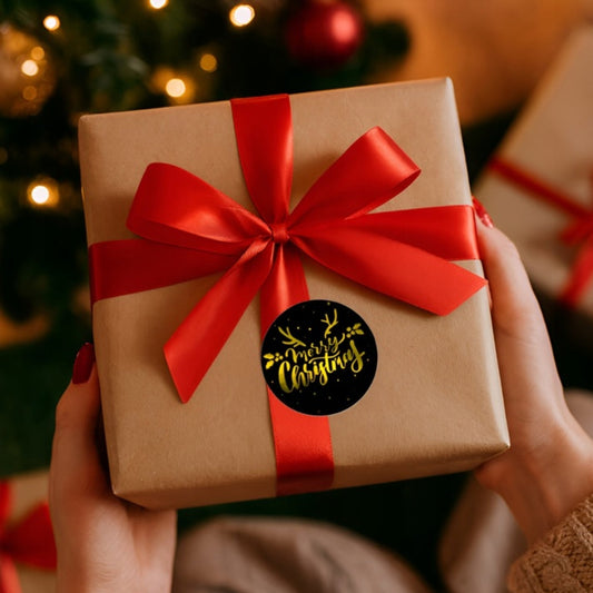 Naklejki na prezenty, upominki, pudełka - NALEPKI ŚWIĄTECZNE - "MERRY CHRISTMAS" - CZARNO-ZŁOTE