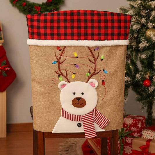 Pokrowiec świąteczny na oparcie krzesła - ŚWIĄTECZNY BIAŁY MIŚ - LNIANY POKROWIEC ŚWIĄTECZNY