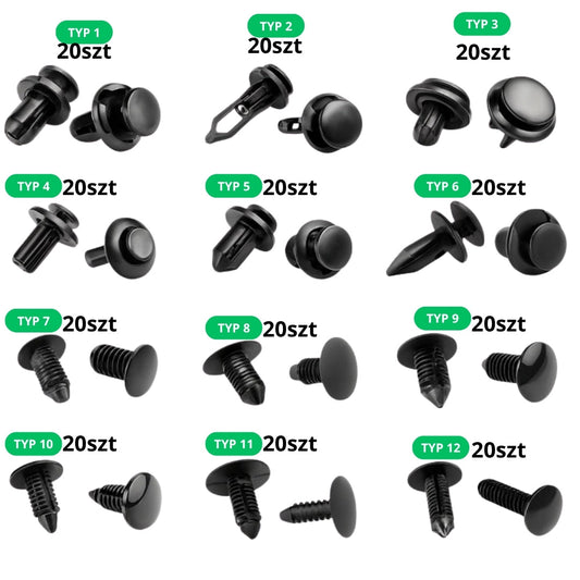 Zestaw klipsów, spinek i ściągaczy samochodowych