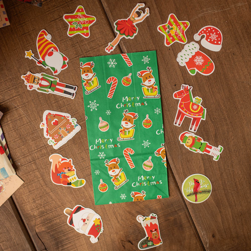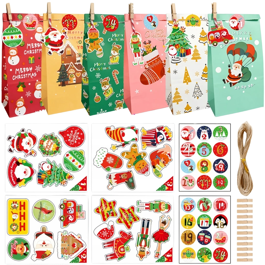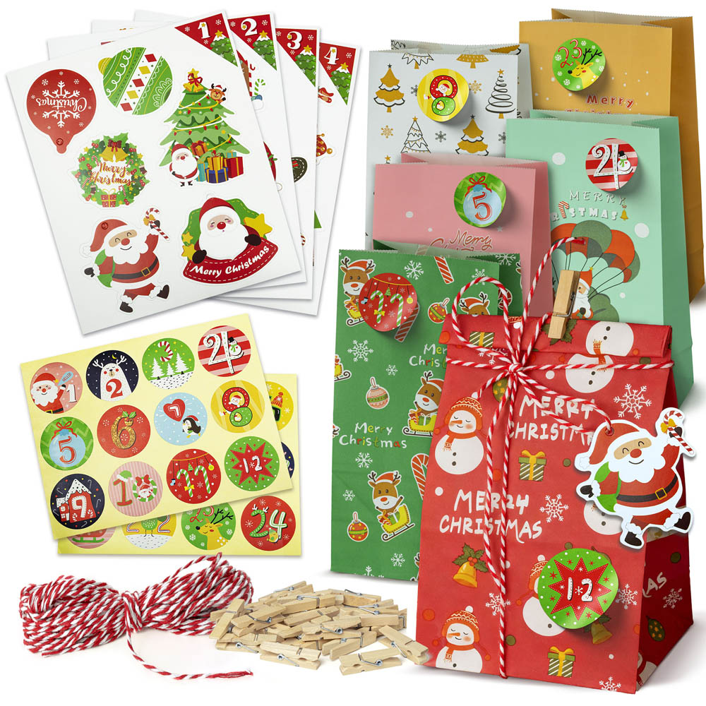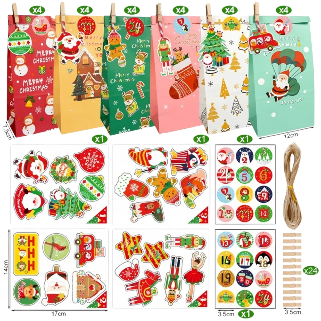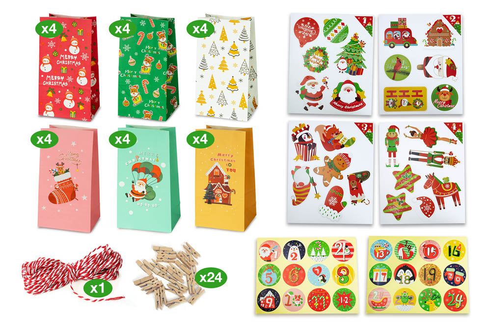 Ilość sztuk w zestawie: 24x torebki(6 różnych wzorów), 24x klips, 24x naklejka, 25x zawieszka, 1x 10m linki.