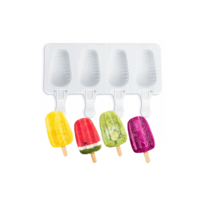 Silikonowa forma do lodów na patyku - 4-komorowa, w kolorze białym. Idealna do przygotowania domowych lodów, deserów, ciast lub mrożonych przekąsek. Dzięki wyżłobieniu na patyczki i elastycznemu materiałowi, forma zapewnia łatwe wyjmowanie oraz estetyczny efekt końcowy.