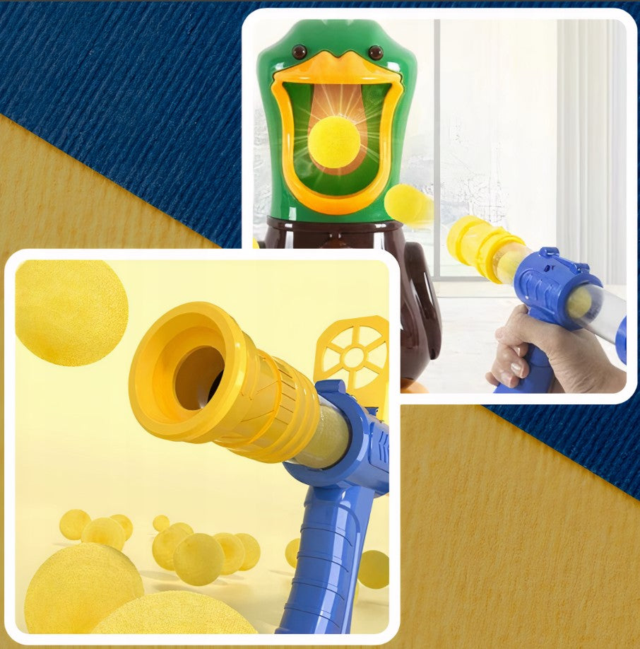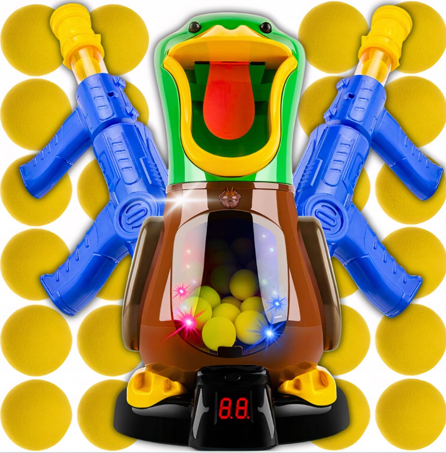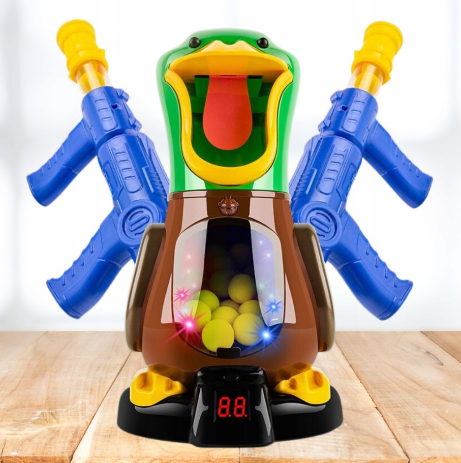 Nakarm kaczuszkę piankowymi piłeczkami, za pomocą dołączonego do zestawu pistoletu.