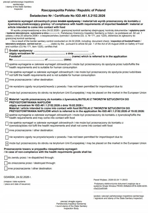 Butelki przeszły graniczną kontrolę Sanepidu (Państwowa Inspekcja Sanitarna, Gdynia, luty 2026) i otrzymały świadectwo dopuszczenia do kontaktu z żywnością oraz do obrotu na terenie całej Unii Europejskiej.