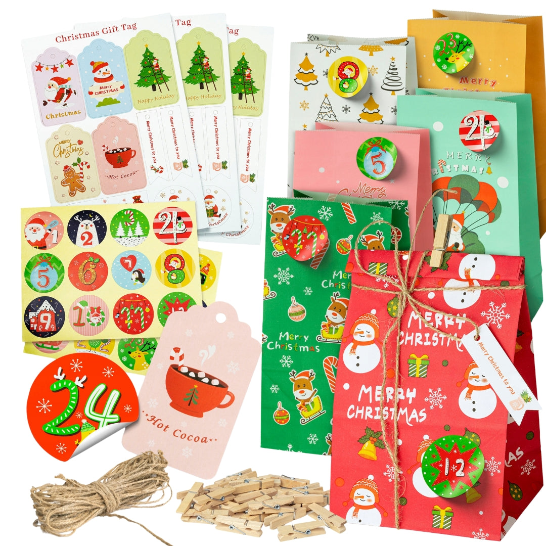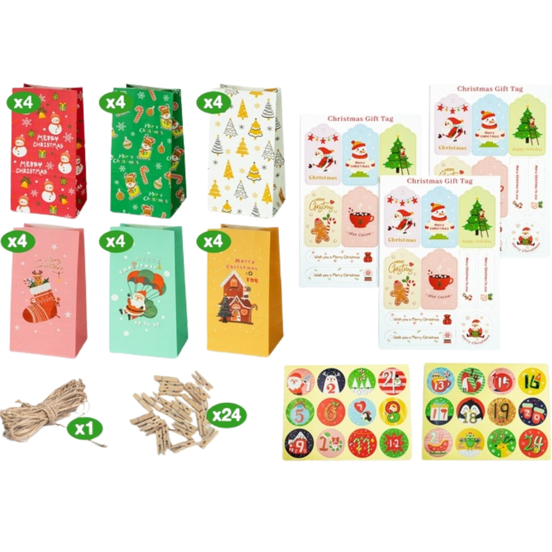Ilość sztuk w zestawie: 24x torba papierowa(6 różnych wzorów), 24x klamerka, 24x naklejki, 30x etykietka.