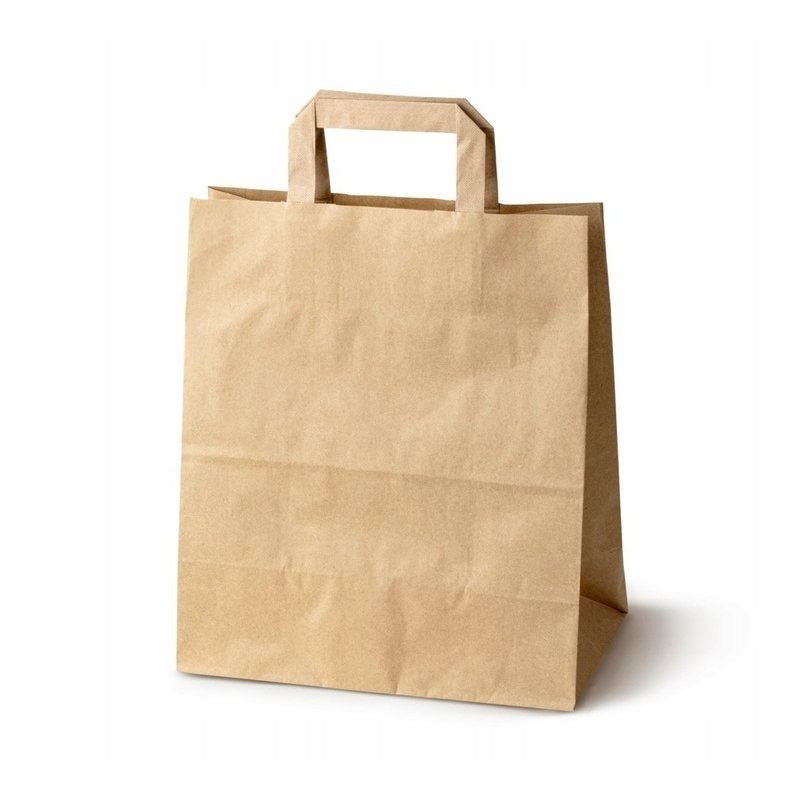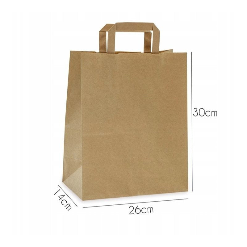 Zestaw 50 papierowych toreb w kolorze brązowym, wykonanych z wytrzymałego papieru kraft o gramaturze ok. 70 g/m². Praktyczne i estetyczne opakowanie do zakupów, prezentów i materiałów reklamowych. Dzięki skręcanym uchwytom torby są wygodne i trwałe. Ilość: 50 sztuk Kolor: brązowy (kraft) Wymiary: 26 cm szerokości x 14 cm głębokości x 30 cm wysokości Uchwyt: papierowy, skręcany Materiał: papier kraft Zastosowanie: torby prezentowe, zakupowe, promocyjne